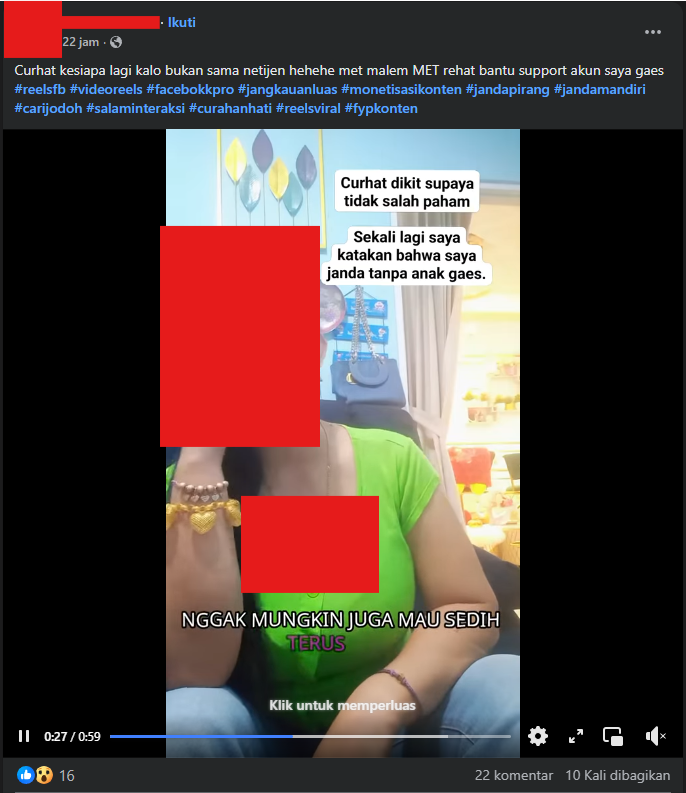 Kebanyakan pengguna FB Pro tidak lagi tahu di mana batas antara ruang pribadi dan publik. Mereka membagikan semuanya: curhat rumah tangga, masalah anak, drama tempat kerja, sampai tragedi orang lain seperti kecelakaan, kesedihan, bahkan bencana alam semua dijadikan konten.