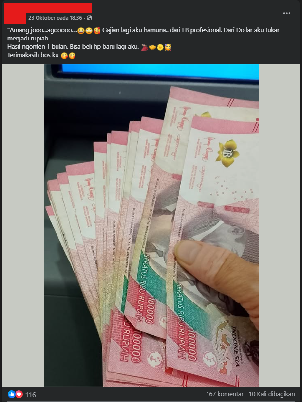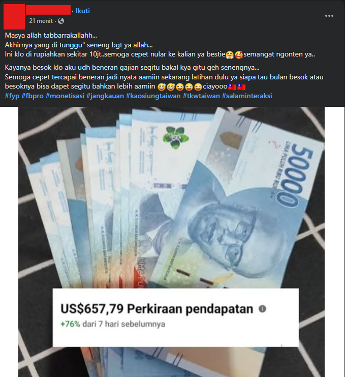 Beberapa posting bahkan menampilkan bukti “penghasilan” tangkapan layar dengan angka bonus FB Pro yang kemudian jadi pemicu FOMO massal. Dari satu unggahan, muncul ratusan komentar “ikut aktif biar gajian juga”, “semangat, biar kayak ini”, “kapan cair juga ya Allah 😭”.