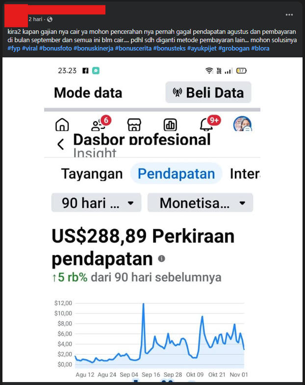 Yang menyebar justru rumor-rumor: “teman saya gajian 8 juta dari FB Pro”, “asal rajin posting bisa cair tiap bulan”, “yang penting aktif, nanti Meta lihat dan kasih bonus”.