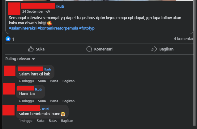 Facebook (atau Meta) tak pernah menyuruh siapapun untuk oversharing, komen “salam interaksi”, atau pasang tagar template.