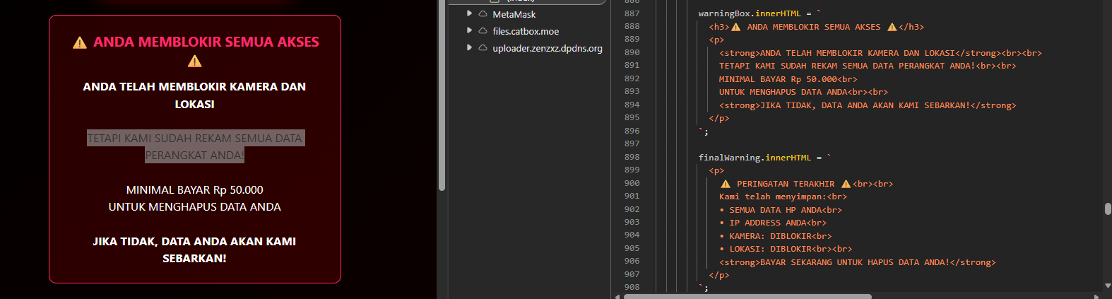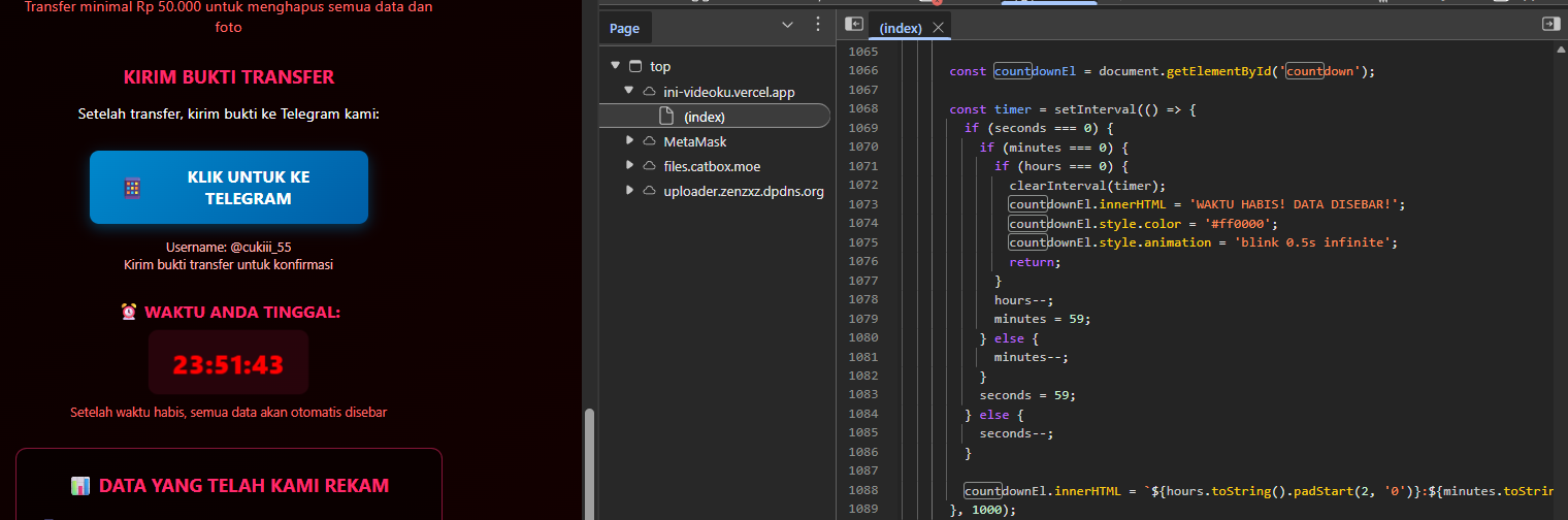 Desain halaman dibuat agresif: dominasi warna merah, ikon peringatan, layout padat, serta countdown timer berbasis setInterval untuk mensimulasikan batas waktu. Ketika foto korban berhasil ditampilkan, ancaman terasa personal dan nyata, meskipun akses kamera terjadi karena izin eksplisit dari pengguna.