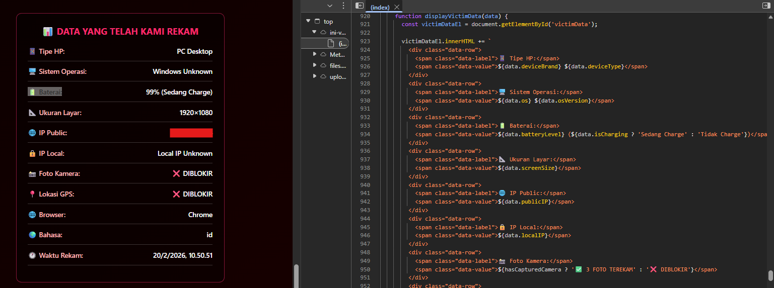 Setelah data terkirim, tahap berikutnya adalah manipulasi tampilan untuk menciptakan tekanan psikologis. Script menyuntikkan data korban (IP, perangkat, lokasi, dll.) ke dalam template HTML menggunakan manipulasi DOM seperti innerHTML atau dynamic rendering. Tidak ada eksploitasi tambahan—yang berubah hanyalah presentasi visual.