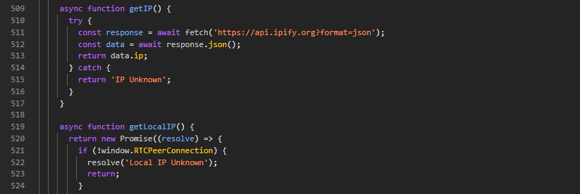 fetch('https://api.ipify.org?format=json')IP Lokal (WebRTC) menggunakan teknik ICE candidate melalui: