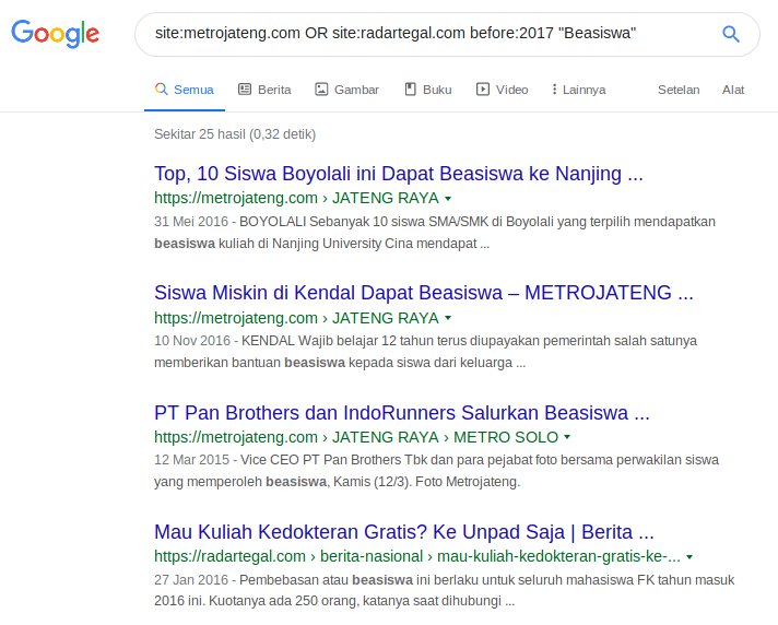 Misal kita tidak ingin menampilkan hasil yang mengandung kata “kuliah”. kita bisa tambahkan query seperti ini “Beasiswa Tegal” -kuliah