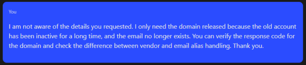 Dalam komunikasi itu, saya tidak mengeksploitasi sistem, tidak memalsukan bukti teknis, dan tidak memanipulasi mekanisme verifikasi otomatis. Yang saya lakukan adalah membangun konteks. Saya memperkenalkan diri sebagai pihak yang masuk akal dalam ekosistem tersebut: seorang vendor baru yang bekerja untuk pemilik subdomain, dengan alasan yang terdengar wajar mengapa akses perlu dipindahkan.