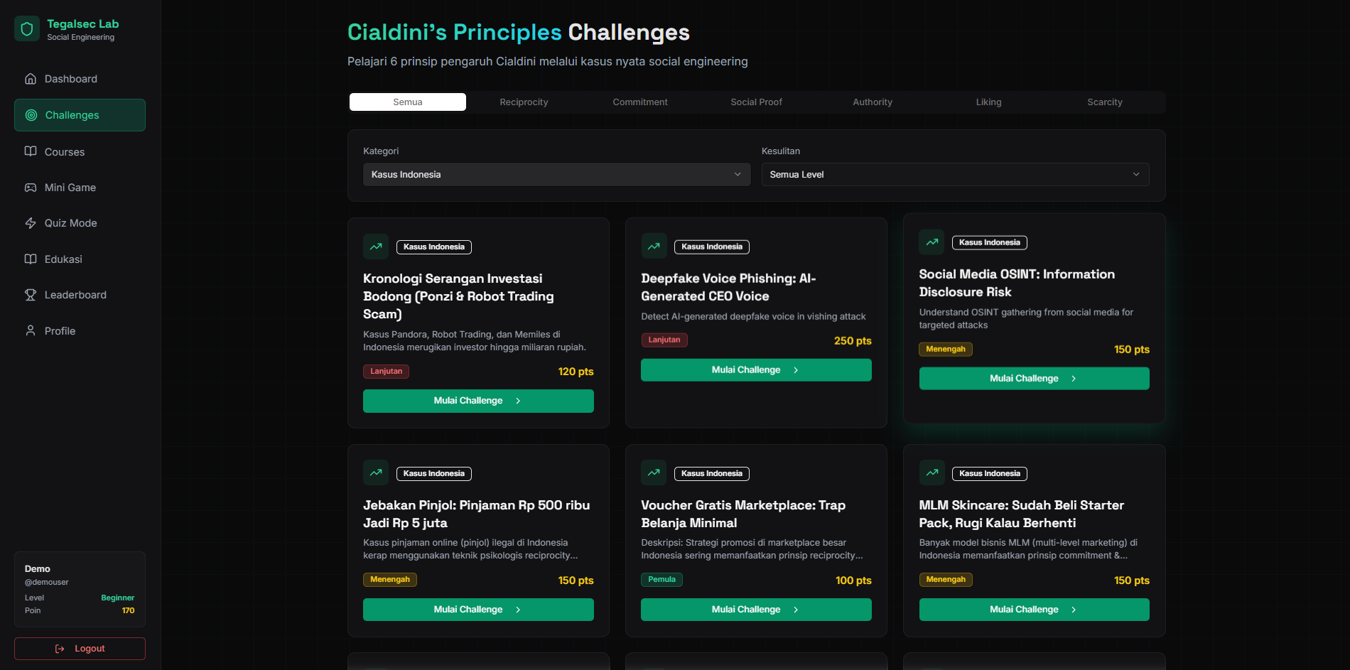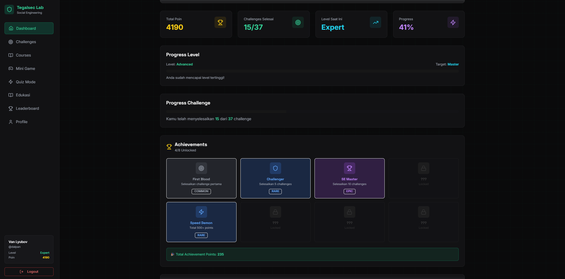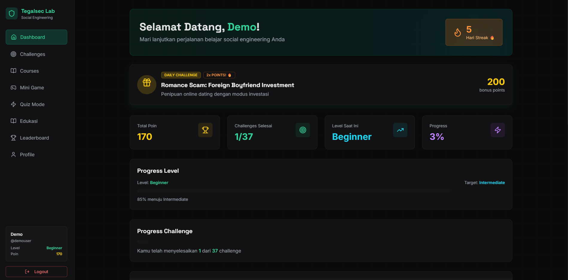 Dashboard juga menampilkan daily challenge skenario sosial engineering yang berubah setiap hari dengan bonus poin ganda.
