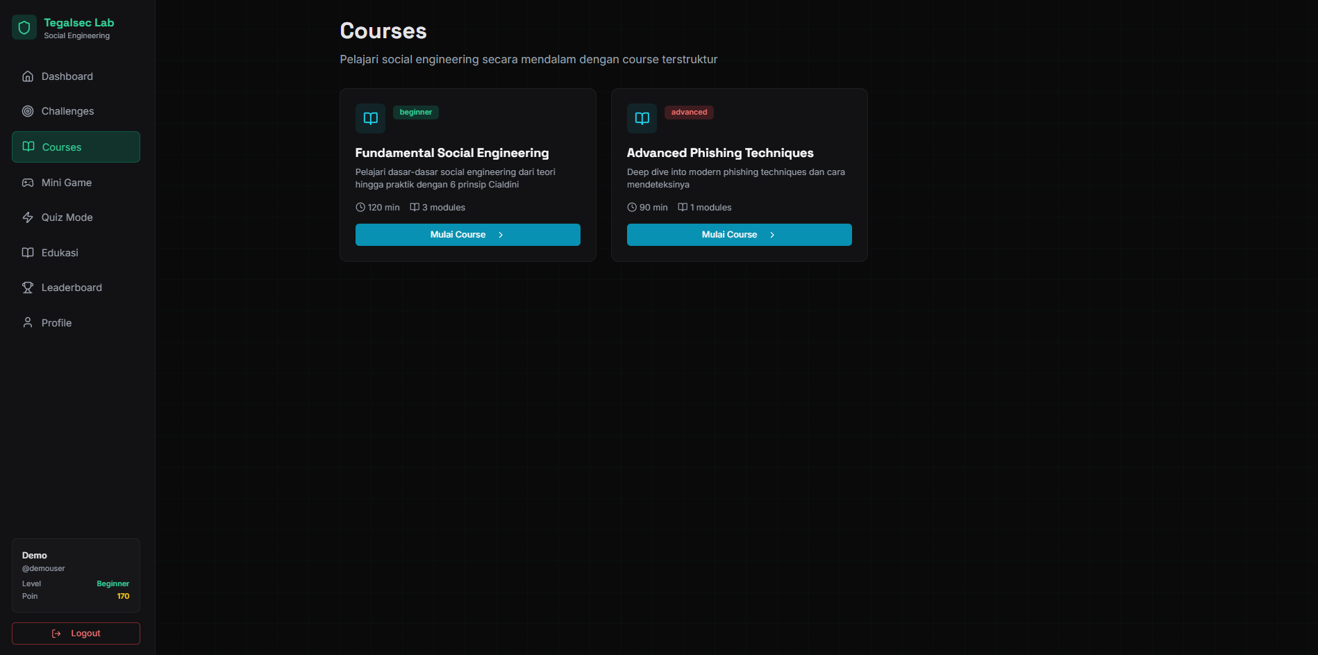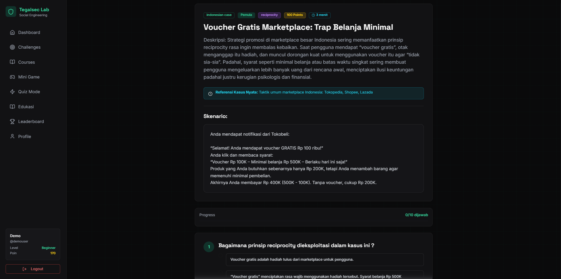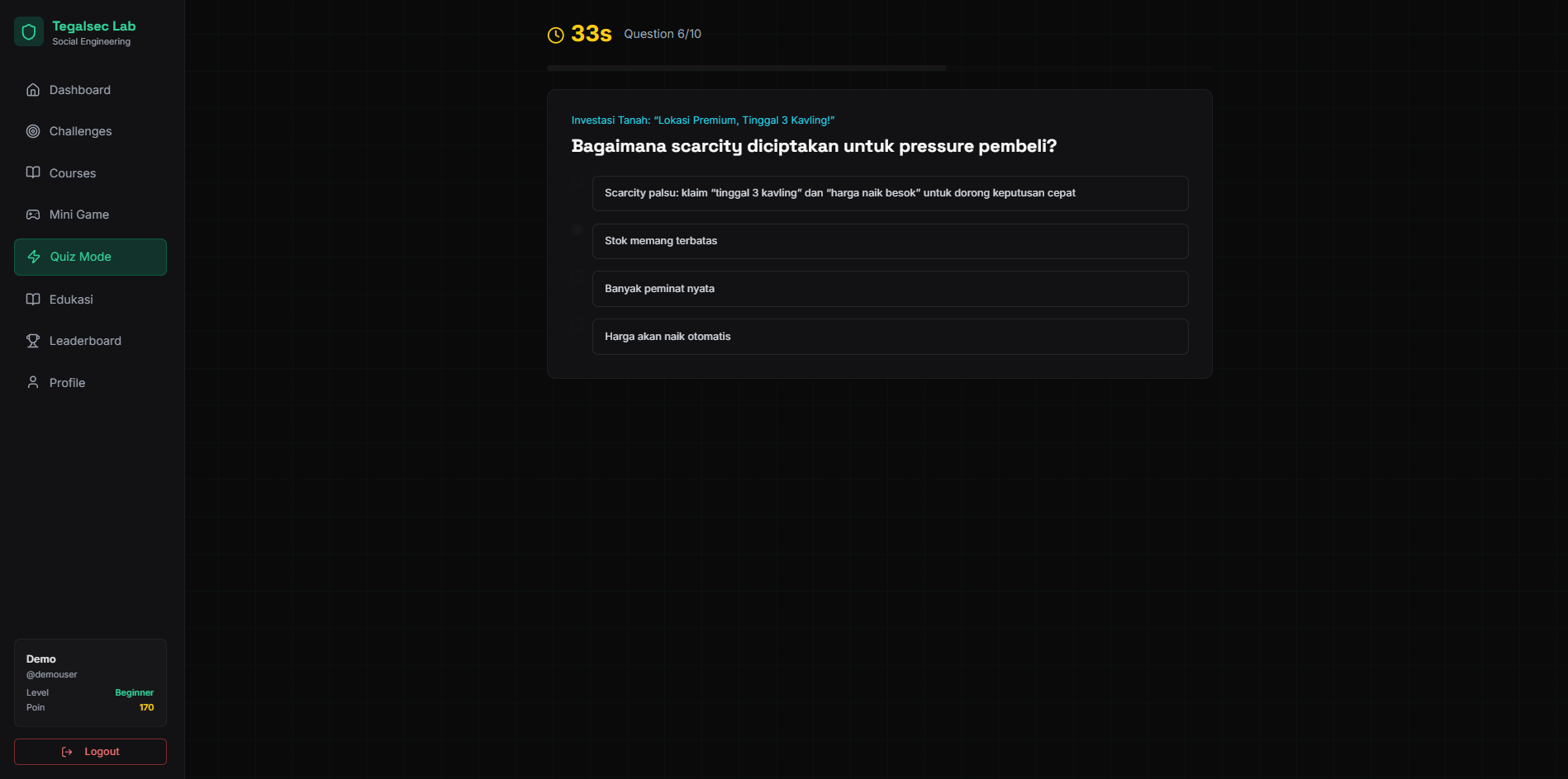 Inilah ruang yang coba diisi SocEng Lab platform laboratorium interaktif di bawah Tegalsec, yang bertujuan membangun muscle memory dalam mengenali dan mematahkan manipulasi sosial.