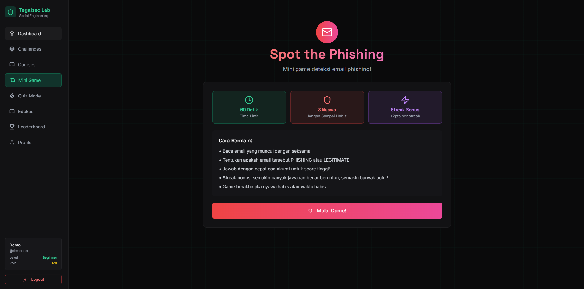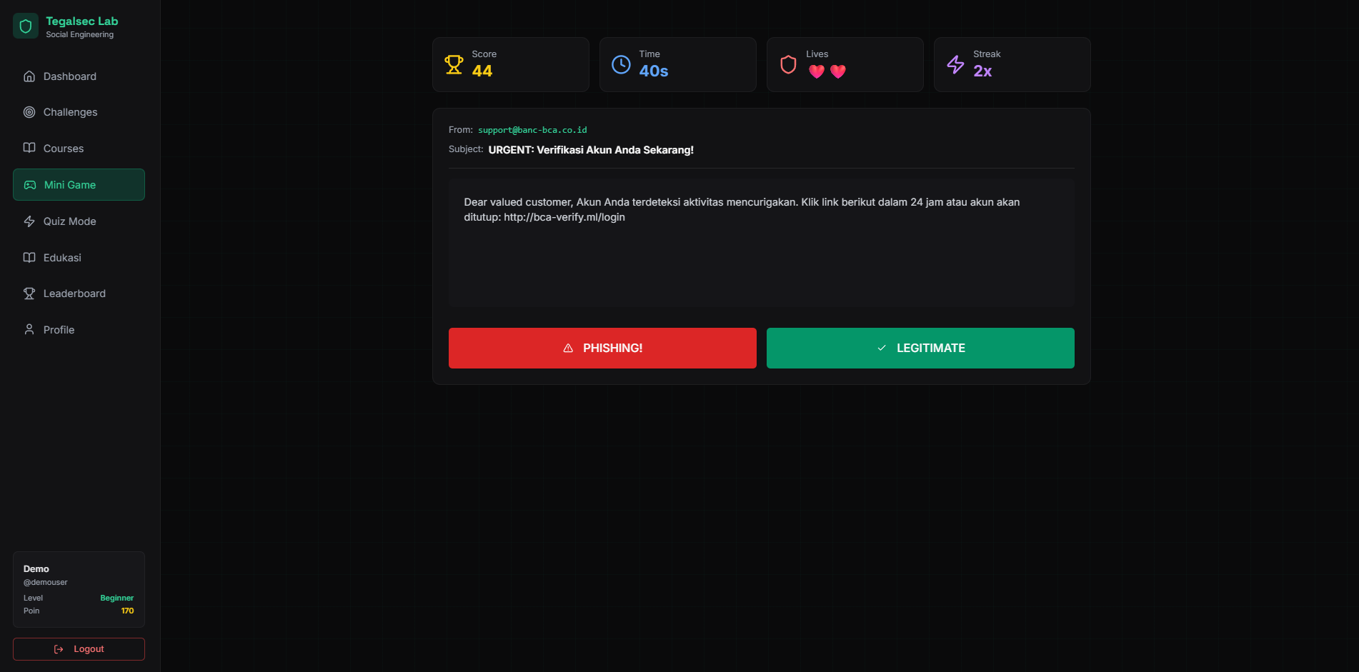 Salah satu fitur paling populer di lab ini adalah mini game deteksi email phishing.