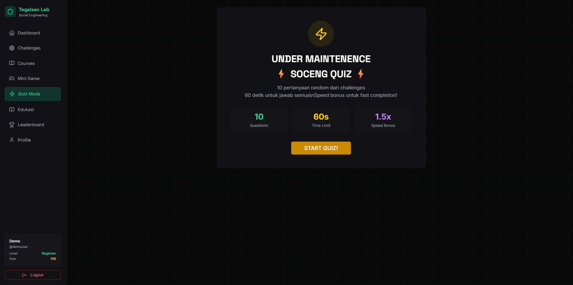 Untuk peserta yang sudah memahami banyak challenge, tersedia SocEng Quiz Mode.