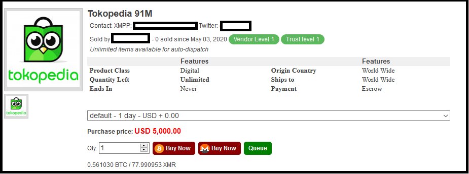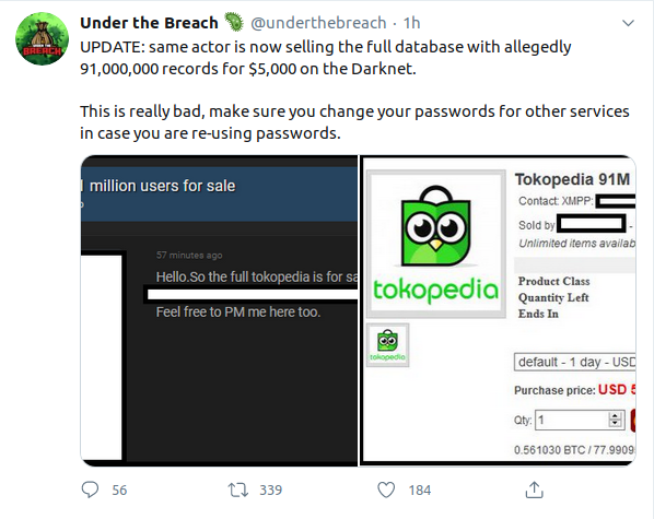 Kembali merilis sebuah informasi dimana hacker yang sama telah mengclaim sebuah data yang dicuri sebanyak 91 Juta akun yang dijual disebuah marketplace di darknet dengan harga $5000 atau setara 73 Juta rupiah.